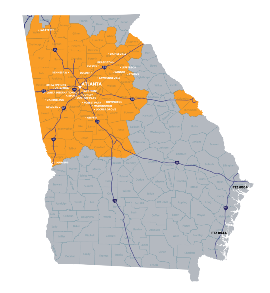 Georgia Foreign-Trade Zone works with companies throughout our federally approved FTZ Service Area surrounding the Atlanta Port of Entry. If your business is within this Service Area, site specific FTZ applications can be approved for warehousing/distribution operations by the FTZ Board in 30 days. The review and approval process for operations involving manufacturing or production usually takes 3 – 6 months.